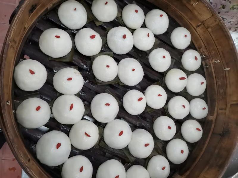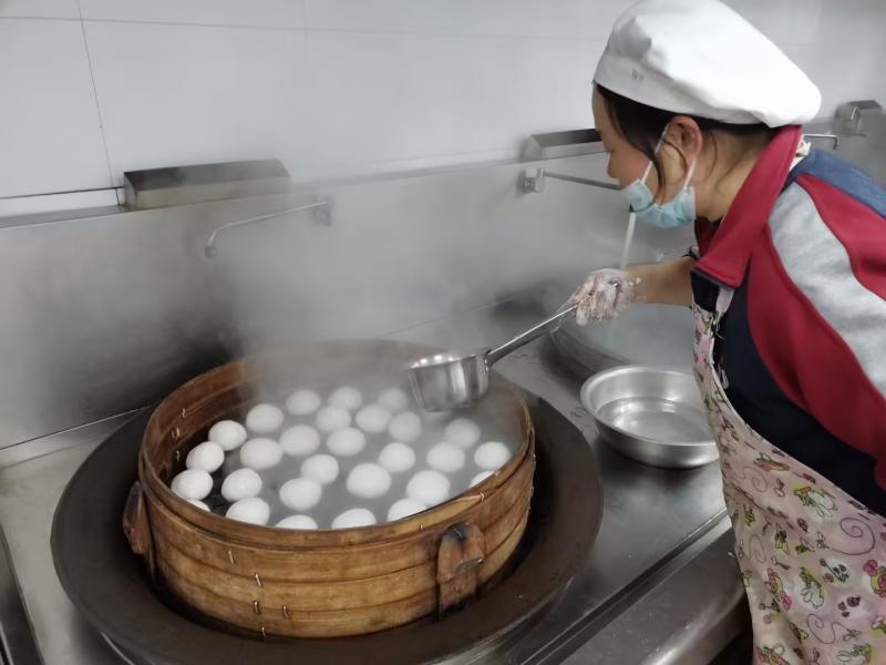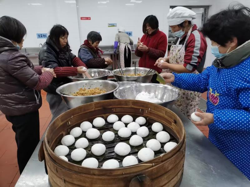 食堂人员前一天就准备好了食材:糯米、粳米、萝卜、大葱,并提前刨丝拌料准备,大米按一定比例配制后碾粉。大家揉粉搓圆,加入萝卜丝馅料,再揉搓后上锅蒸熟,一个个圆溜溜、香糯糯的冬至粑粑就做成了。大家吃着这么味道好的时令产品,心里也甜滋滋的。
