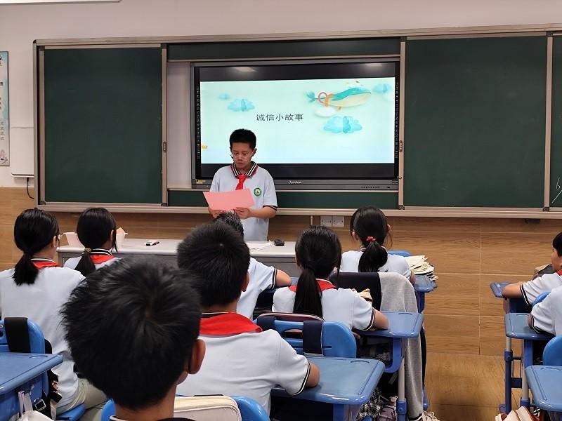 各班组织学生开展讲诚信故事比赛,学生们通过查找书籍和报刊、浏览网页等多种途径收集有关“诚信”的名人故事,他们在自主学习的过程中激发了向榜样学习的动力,体会到诚信是做人的根本。