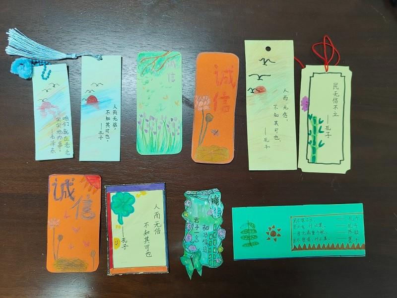 学生们制作了精美的书签,上面写着关于诚信的名言警句,时刻提醒着学生们要诚实守信、言行一致、表里如一。