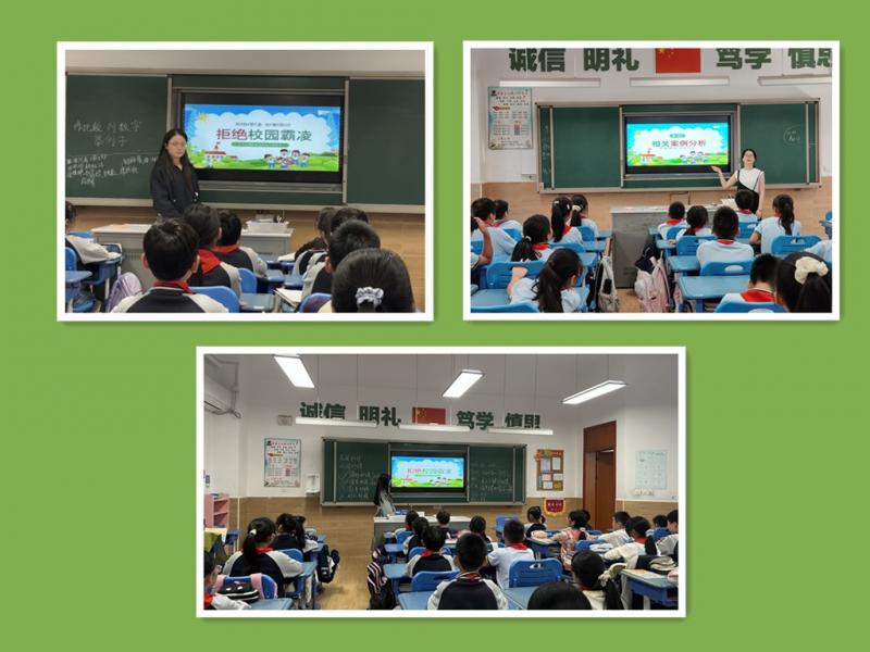 为扩大教育覆盖面,营造全员参与的反欺凌氛围,学校还整合校园宣传资源,构建了全方位宣传矩阵。其中,红领巾小广播作为校园宣传的重要阵地,专门推出“拒绝校园欺凌”主题专栏,由学生播音员通过生动的案例解读、反欺凌倡议宣读以及正能量故事分享等形式,每日向全校师生传递反欺凌理念,让文明友善的声音响彻校园每个角落。此外,校园广播台每日午休时段播报反欺凌知识和正能量故事;教学楼大厅的宣传栏更新了“反校园欺凌”专题内容,通过图文结合的形式普及相关法律法规和防护常识;电子屏滚动播放“拒绝校园欺凌 共建和谐校园”等标语,让反欺凌理念随处可见、入脑入心。学校还通过班级群向家长推送反欺凌教育要点,呼吁家长配合学校关注孩子情绪变化,形成家校共育的强大合力。