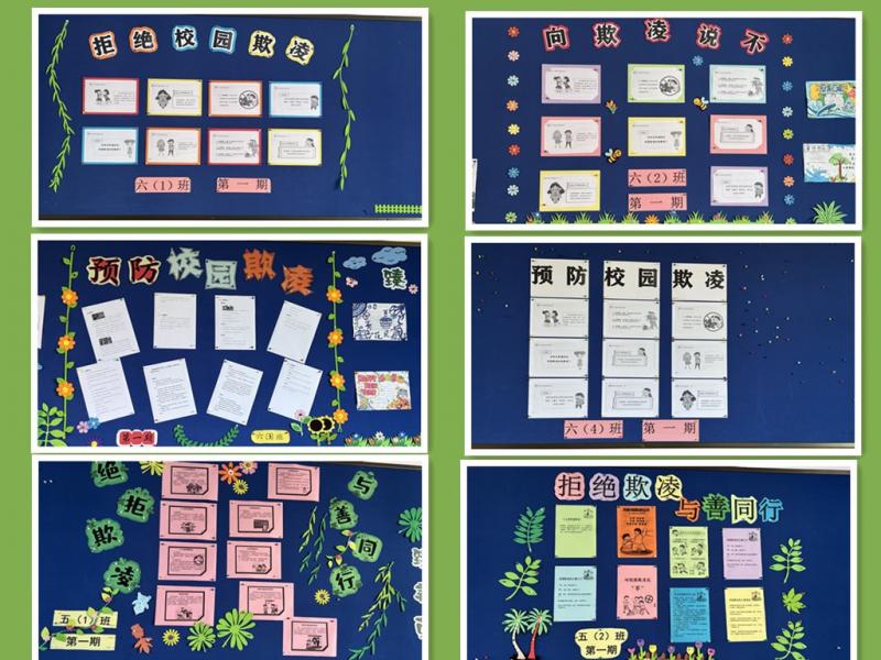 主题板报展评成为校园里一道亮眼的教育风景线。五六年级各班级围绕“反校园欺凌”核心主题,充分发挥想象力与创造力,师生携手共同构思版面、搜集素材、绘制创作。各班板报主题鲜明、内容丰富,有的以醒目标题“对校园欺凌说不”直击主题,配以生动插画展现同学间互助友爱的场景;有的系统梳理了校园欺凌的主要形式,包括肢体冲突、言语侮辱、社交孤立等,并用简洁文字剖析其危害;还有的专门开辟“应对指南”板块,清晰标注遇到欺凌时的求助方式和解决途径。学校组织德育处教师和学生代表组成评审小组,对各班板报进行集中评选,让反欺凌理念在潜移默化中深入人心。