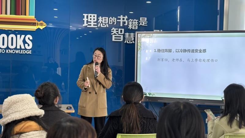 会议首项议程特邀盛泽实验小学沈娟副校长作专题讲座《校园突发事件处理流程与沟通艺术》。沈校长结合自身多年德育管理经验,通过“案例剖析+流程拆解+沟通技巧提炼”的立体化分享,系统讲解了校园突发事件(如学生意外伤害、家校矛盾、公共安全事件等)的“黄金处理四步法”:快速响应(第一时间保护现场、救助学生)、分级上报(按程序联系校医、分管领导及家长)、科学处置(依据预案协调资源)、有效沟通(针对不同对象——学生、家长、上级部门——采用差异化沟通策略)。讲座中,沈校长特别强调“沟通艺术”的关键性:“处理突发事件时,‘共情’比‘解释’更重要,‘行动’比‘承诺’更关键”,并通过真实调解案例(如学生课间碰撞引发的家校纠纷化解过程),直观展示了“倾听-共情-说明-解决”的沟通模型,为班主任应对复杂情境提供了可复制的操作指南。现场班主任认真记录,纷纷表示“既有理论高度,又有实操方法,对日常班级安全管理很有启发”。